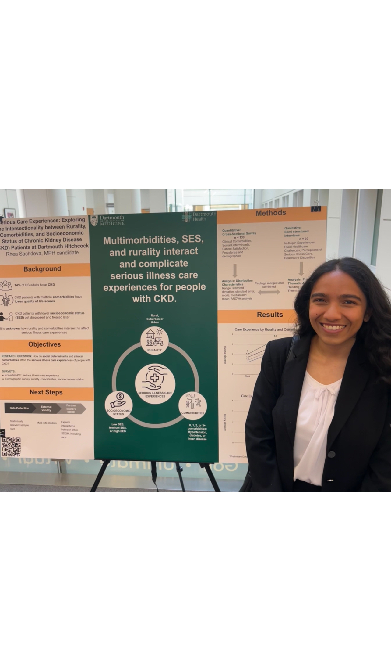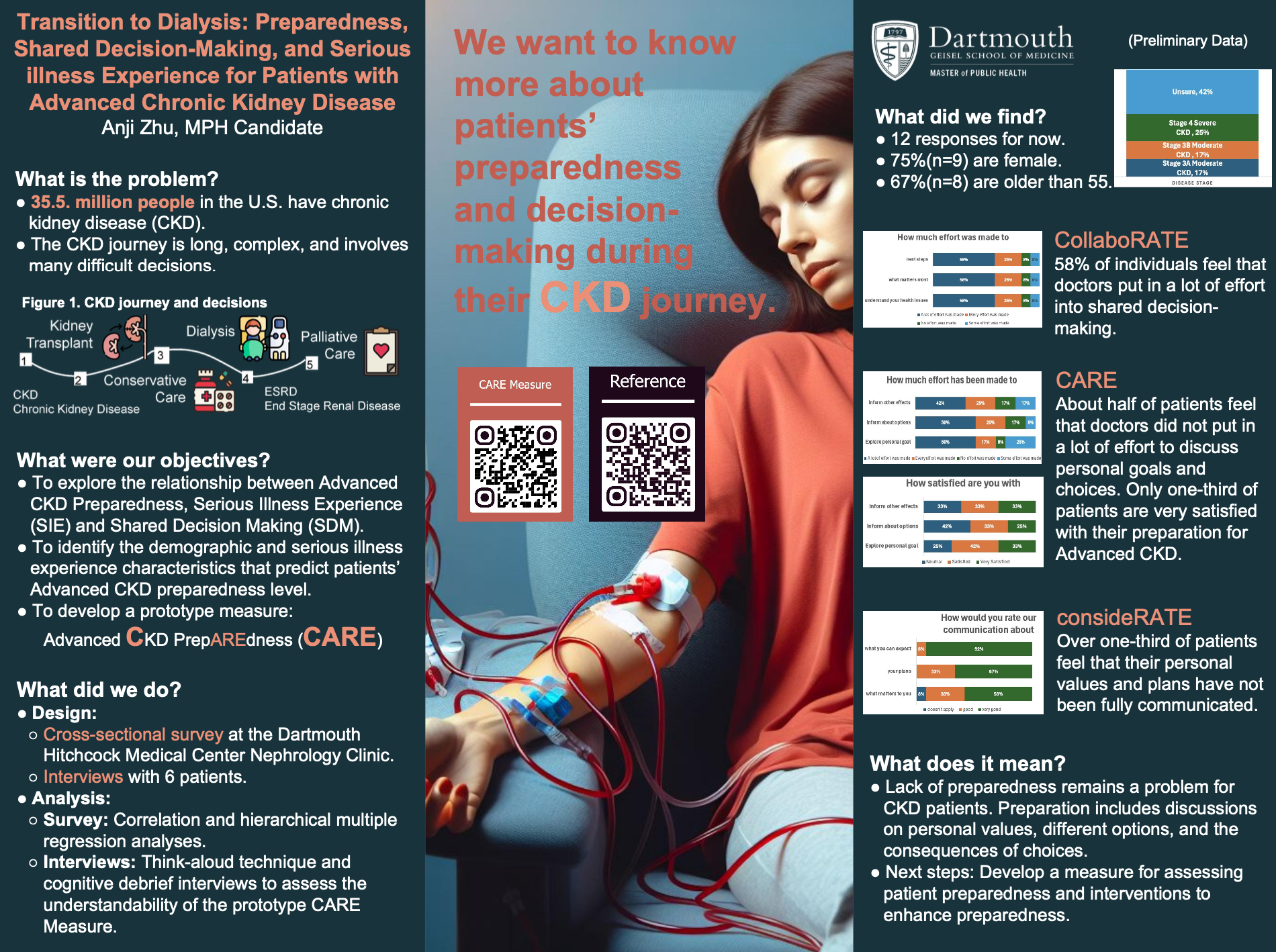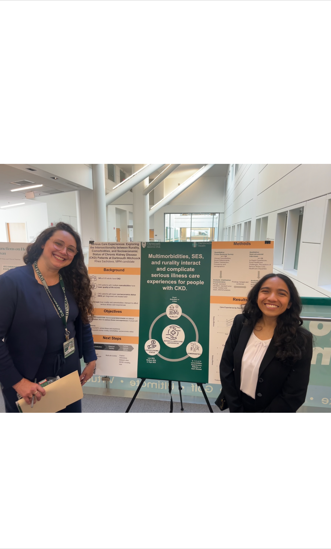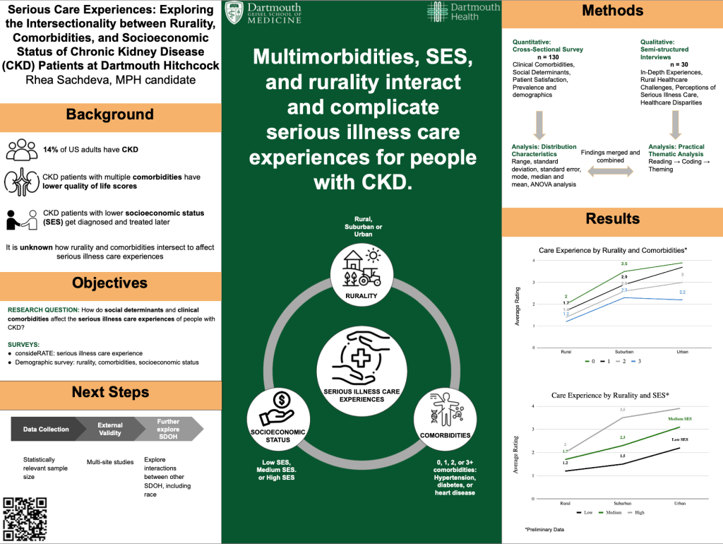 This project focuses on serious care experiences and explores the intersectionality between rurality, comorbidities, and socioeconomic status of chronic kidney disease (CKD) patients at Dartmouth Hitchcock. Additionally, Rhea and HEx Lab Team distributed a survey that consisted of consideRATE (a measure of serious illness experience) and demographic questions related to rurality, comorbidities, and socioeconomic status.