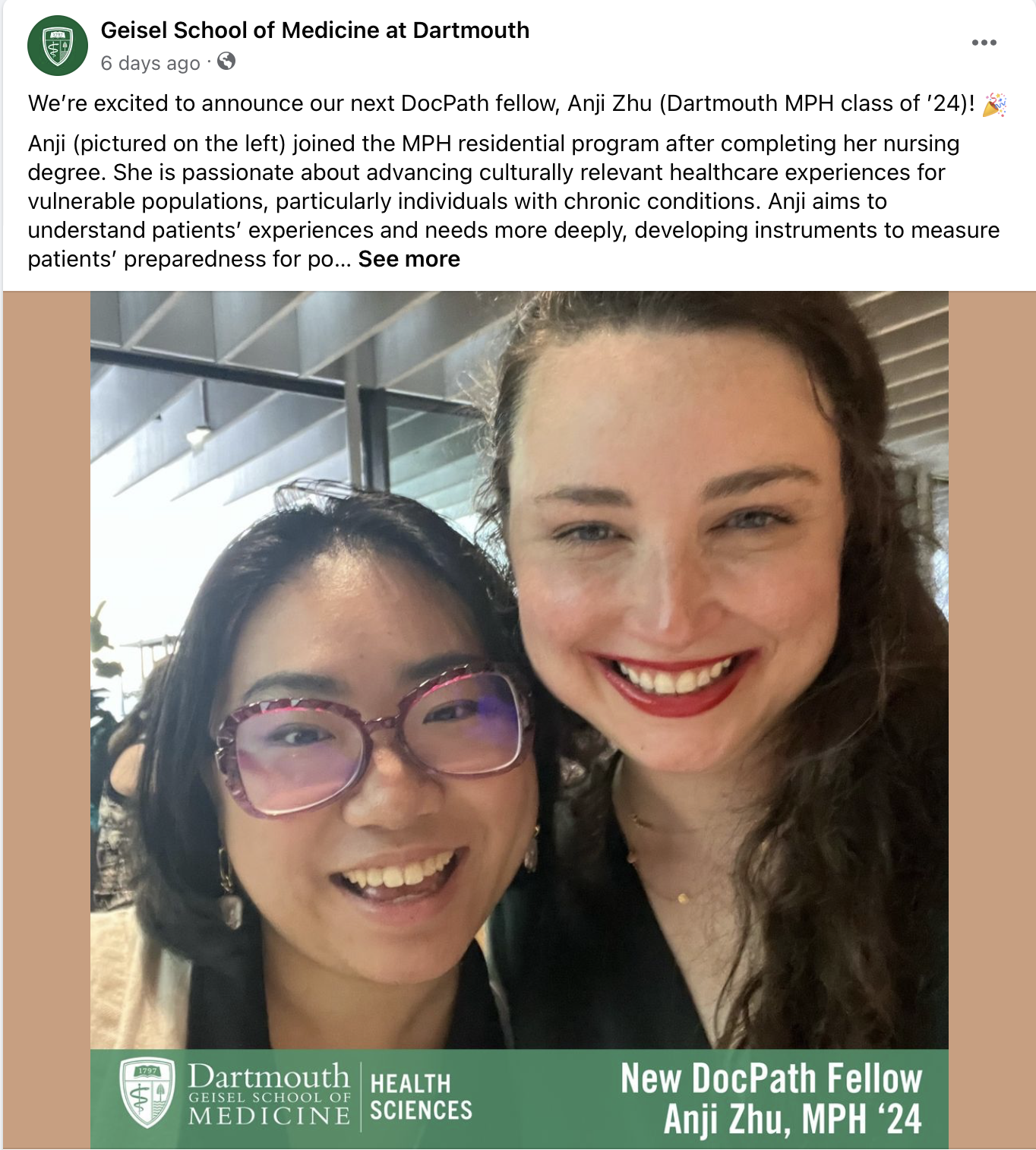 Congratulations to our DocPath fellow, Anji Zhu, on starting her DocPath program at Dartmouth Geisel School of Medicine. We are excited to continue working with you!